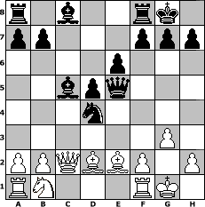 Partie-Notation im PGN-Format [Event "Franzoesisch"] [Site "www.mySchach.de"] [Date "2013.03.26"] [Round "1"] [White "Sanji"] [Black "Helmut48"] [ECO "C02"] [WhitemyELO "1613"] [BlackmyELO "1966"] [Result "0-1"] [TimeControl "10/1728000"] [WhiteDays "18"] [BlackDays "20"] [MySchachNr "87470"] 1. e4 e6 2. d4 d5 3. e5 c5 4. c3 Nc6 5. Nf3 Qb6 6. Be2 Nh6 7. O-O cxd4 8. cxd4 Nf5 9. Re1 Nfxd4 10. Nxd4 Qxd4 11. Bd2 Bc5 12. Rf1 O-O 13. Qc2 Qxe5 14. g3 Nd4 0-1 Stellungs-Notation im FEN-Format r1b2rk1/pp3ppp/4p3/2bpq3/3n4/6P1/PPQBBP1P/RN3RK1 - - - 1 15 Geschlagene Figuren Weiss: Geschlagene Figuren Schwarz: Klicken Sie auf eine geschlagene Figur um den gewünschten Zug darzustellen!
