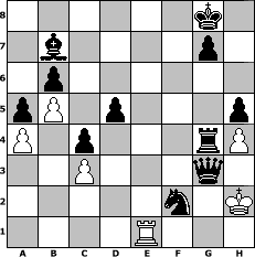 Partie-Notation im PGN-Format [Event "Herbstturnier 2025"] [Site "www.mySchach.de"] [Date "2025.09.16"] [Round "1"] [White "Achimkogge"] [Black "deepsabel"] [ECO "D00"] [WhitemyELO "1215"] [BlackmyELO "1798"] [Result "0-1"] [TimeControl "10/1728000"] [WhiteDays "76"] [BlackDays "74"] [MySchachNr "133654"] 1. d4 d5 2. c3 Nf6 3. Bf4 e6 4. Bg5 Nbd7 5. Nf3 Be7 6. Qa4 O-O 7. Nbd2 c6 8. b4 a5 9. b5 c5 10. e3 b6 11. Qc2 Bb7 12. Ne5 Nxe5 13. dxe5 Nd7 14. Bf4 f6 15. Bd3 fxe5 16. Bg3 e4 17. Be2 c4 18. O-O Nc5 19. f4 Nd3 20. a4 Bc5 21. Kh1 Bxe3 22. Rad1 Qf6 23. Bg4 Qg6 24. h3 h5 25. Bxe6+ Qxe6 26. Kh2 Qh6 27. h4 Bxf4 28. Bxf4 Rxf4 29. Kg1 Raf8 30. Nf3 exf3 31. g3 Rg4 32. Kh2 Qd6 33. Rxf3 Rxf3 34. Qg2 Rf2 35. Qxf2 Nxf2 36. Re1 Qxg3# 0-1 Stellungs-Notation im FEN-Format 6k1/1b4p1/1p6/pP1p3p/P1p3rP/2P3q1/5n1K/4R3 - - - 0 37 Geschlagene Figuren Weiss: Geschlagene Figuren Schwarz: Klicken Sie auf eine geschlagene Figur um den gewünschten Zug darzustellen!