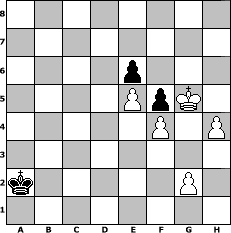 Partie-Notation im PGN-Format [Event "April 2018"] [Site "www.mySchach.de"] [Date "2018.04.11"] [Round "1"] [White "reisinger"] [Black "lotchi"] [ECO "A50"] [WhitemyELO "1459"] [BlackmyELO "1085"] [Result "1-0"] [TimeControl "10/1728000"] [WhiteDays "100"] [BlackDays "040"] [MySchachNr "111935"] 1. d4 Nf6 2. c4 d5 3. Nc3 Nc6 4. Bg5 e6 5. e4 Bb4 6. e5 Bxc3+ 7. bxc3 h6 8. Bxf6 gxf6 9. Nf3 dxc4 10. Bxc4 fxe5 11. dxe5 Qxd1+ 12. Rxd1 Rg8 13. O-O a6 14. Rd2 b5 15. Bb3 b4 16. cxb4 Ke7 17. Rfd1 Rd8 18. Rxd8 Nxd8 19. Nd4 Bb7 20. Rc1 c6 21. f4 f5 22. h3 a5 23. b5 cxb5 24. Nxb5 Rc8 25. Rd1 Bc6 26. Na7 Rc7 27. Nxc6+ Nxc6 28. Rd6 Nd8 29. Ra6 Rc1+ 30. Kh2 Nc6 31. Ba4 Kd7 32. Rxa5 Kc7 33. Ra6 h5 34. Rxc6+ Rxc6 35. Bxc6 Kxc6 36. Kg3 Kb5 37. Kh4 Kb4 38. Kxh5 Ka3 39. Kg5 Kxa2 40. h4 1-0 Stellungs-Notation im FEN-Format 8/8/4p3/4PpK1/5P1P/8/k5P1/8 - - - 0 40 Geschlagene Figuren Weiss: ![]() ![]() ![]() ![]() ![]() ![]() ![]() ![]() ![]() ![]() ![]() ![]() ![]() ![]() ![]() Geschlagene Figuren Schwarz: ![]() ![]() ![]() ![]() ![]() ![]() ![]() ![]() ![]() ![]() ![]() ![]() ![]() ![]() ![]() Klicken Sie auf eine geschlagene Figur um den gewünschten Zug darzustellen!
