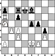 Partie-Notation im PGN-Format [Event "Winter 2011/12"] [Site "www.mySchach.de"] [Date "2011.12.22"] [Round "2"] [White "bjeu"] [Black "Koprek"] [ECO "B30"] [WhitemyELO "2115"] [BlackmyELO "1996"] [Result "1-0"] [TimeControl "10/2592000"] [WhiteDays "15"] [BlackDays "85"] [MySchachNr "78417"] 1. e4 c5 2. Nf3 Nc6 3. g3 Nf6 4. d3 d6 5. Bg2 e6 6. O-O Be7 7. Re1 O-O 8. Nbd2 Bd7 9. e5 Ne8 10. exd6 Nxd6 11. c3 Qb6 12. Nb3 Rad8 13. Bf4 f6 14. Nfd2 e5 15. Be3 Nf5 16. Bd5+ Kh8 17. Nc4 Nxe3 18. Nxb6 Nxd1 19. Nxd7 Rxd7 20. Bxc6 bxc6 21. Raxd1 Rb8 22. Re4 g6 23. Kf1 Kg7 24. Ke1 Rbd8 25. Ra4 Kf7 26. Rd2 Rb8 27. Kd1 h5 28. Kc2 Bf8 29. Re2 Be7 30. Ra5 Rb5 31. Re4 Rxa5 32. Nxa5 Rc7 33. Nb3 Ke6 34. Ra4 Kd6 35. Ra5 c4 36. dxc4 f5 37. Ra6 Kd7 38. Nc1 g5 39. b4 Kc8 40. Nb3 h4 41. Kd3 g4 42. Na5 Kd7 43. Ke2 hxg3 44. hxg3 1-0 Stellungs-Notation im FEN-Format 8/p1rkb3/R1p5/N3pp2/1PP3p1/2P3P1/P3KP2/8 - - - 0 44 Geschlagene Figuren Weiss: Geschlagene Figuren Schwarz: Klicken Sie auf eine geschlagene Figur um den gewünschten Zug darzustellen!