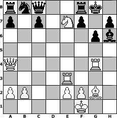 Partie-Notation im PGN-Format [Event "Aljechin Verteidigung 2009"] [Site "www.mySchach.de"] [Date "2009.10.28"] [Round "1"] [White "HenrySchinasky"] [Black "rgHD"] [ECO "B03"] [WhitemyELO "2113"] [BlackmyELO "1556"] [Result "1-0"] [TimeControl "10/864000"] [WhiteDays "30"] [BlackDays "27"] [MySchachNr "60212"] 1. e4 Nf6 2. e5 Nd5 3. d4 d6 4. c4 Nb6 5. exd6 exd6 6. Nc3 Be7 7. Nf3 Bg4 8. Be3 O-O 9. h3 Bh5 10. g4 Bg6 11. h4 d5 12. h5 Be4 13. c5 N6d7 14. Rh3 b6 15. h6 g6 16. Qb3 Nc6 17. Qa4 Bxf3 18. Rxf3 Ndb8 19. Bg2 bxc5 20. Rd1 cxd4 21. Bxd4 Qd7 22. Re3 Bg5 23. Nxd5 Qxg4 24. Kf1 Nxd4 25. Rxd4 Qc8 26. Rg4 Bxh6 27. Ne7+ 1-0 Stellungs-Notation im FEN-Format rnq2rk1/p1p1Np1p/6pb/8/Q5R1/4R3/PP2PPB1/5K2 - - - 1 27 Geschlagene Figuren Weiss: Geschlagene Figuren Schwarz: Klicken Sie auf eine geschlagene Figur um den gewünschten Zug darzustellen!