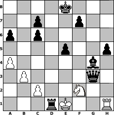 Partie-Notation im PGN-Format [Event "1. Weltmeisterschaft @ myschach.de"] [Site "www.mySchach.de"] [Date "2006.09.15"] [Round "1"] [White "korn1991"] [Black "bane"] [ECO "D01"] [WhitemyELO "1494"] [BlackmyELO "1933"] [Result "0-1"] [TimeControl "10/2592000"] [WhiteDays "89"] [BlackDays "89"] [MySchachNr "28479"] 1. d4 d5 2. Nc3 Nf6 3. Nf3 Nc6 4. Bg5 e6 5. e3 Be7 6. Bb5 a6 7. Bxc6+ bxc6 8. Ne5 Qd6 9. Bxf6 gxf6 10. Nd3 Rg8 11. Qd2 Rxg2 12. O-O-O Rxh2 13. Nf4 Rxh1 14. Rxh1 e5 15. dxe5 fxe5 16. Nh5 Qg6 17. b3 Bg4 18. Ng3 h5 19. a4 d4 20. exd4 Bg5 21. f4 Bxf4 22. Nce4 Bxd2+ 23. Kxd2 Rd8 24. Nc5 Qh6+ 25. Kc3 Qe3+ 26. Nd3 Qxd4+ 27. Kd2 Qf4+ 28. Ke1 Qxg3+ 29. Nf2 Rd1# 0-1 Stellungs-Notation im FEN-Format 4k3/2p2p2/p1p5/4p2p/P5b1/1P4q1/2P2N2/3rK2R - - - 2 30 Geschlagene Figuren Weiss: ![]() ![]() ![]() ![]() ![]() ![]() ![]() ![]() ![]() ![]() ![]() ![]() ![]() ![]() ![]() Geschlagene Figuren Schwarz: ![]() ![]() ![]() ![]() ![]() ![]() ![]() ![]() ![]() ![]() ![]() ![]() ![]() ![]() ![]() Klicken Sie auf eine geschlagene Figur um den gewünschten Zug darzustellen!