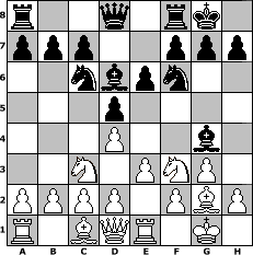 Partie-Notation im PGN-Format [Event "11. Wikinger-Klubmeisterschaft"] [Site "www.mySchach.de"] [Date "2015.03.29"] [Round "1"] [White "Master1"] [Black "MiFie"] [ECO "D02"] [WhitemyELO "1327"] [BlackmyELO "1093"] [Result "1-0"] [TimeControl "10/2592000"] [WhiteDays "21"] [BlackDays "00"] [MySchachNr "98657"] 1. d4 d5 2. Nf3 Bg4 3. Nc3 Nf6 4. e3 Nc6 5. g3 e6 6. Bg2 Bd6 7. O-O O-O 8. Re1 1-0 Stellungs-Notation im FEN-Format r2q1rk1/ppp2ppp/2nbpn2/3p4/3P2b1/2N1PNP1/PPPP1PBP/R1BQR1K1 - - - 5 8 Geschlagene Figuren Weiss: Geschlagene Figuren Schwarz: Klicken Sie auf eine geschlagene Figur um den gewünschten Zug darzustellen!