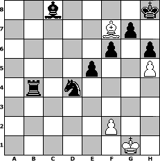 Partie-Notation im PGN-Format [Event "unter uns Nr. 17"] [Site "www.mySchach.de"] [Date "2014.02.13"] [Round "1"] [White "Haneken"] [Black "borsti"] [ECO "C20"] [WhitemyELO "1030"] [BlackmyELO "1263"] [Result "0-1"] [TimeControl "10/864000"] [WhiteDays "28"] [BlackDays "40"] [MySchachNr "92921"] 1. e4 e5 2. d3 Nc6 3. Nf3 Bc5 4. Be2 d6 5. O-O h6 6. Nc3 Qf6 7. Nd5 Qd8 8. c4 Nd4 9. Qa4+ c6 10. Be3 Nxf3+ 11. Bxf3 Bd7 12. Bxc5 cxd5 13. Qb4 dxc5 14. Qxc5 Ne7 15. exd5 Qb6 16. Qa3 Nf5 17. c5 Qb5 18. Rfe1 f6 19. d6 Rc8 20. Qxa7 O-O 21. Bxb7 Rxc5 22. Rec1 Rxc1+ 23. Rxc1 Nxd6 24. Ba6 Qa4 25. Bc4+ Kh7 26. Be6 Qxa7 27. Bd5 Bf5 28. Rc6 Rd8 29. b4 Bxd3 30. h4 Qxa2 31. Bxa2 Nb5 32. g3 Rb8 33. h5 Nd4 34. g4 Rxb4 35. Rc3 Be2 36. Rc8 Bxg4 37. Bg8+ Kh8 38. Bf7+ Bxc8 0-1 Stellungs-Notation im FEN-Format 2b4k/5Bp1/5p1p/4p2P/1r1n4/8/5P2/6K1 - - - 0 39 Geschlagene Figuren Weiss: Geschlagene Figuren Schwarz: Klicken Sie auf eine geschlagene Figur um den gewünschten Zug darzustellen!