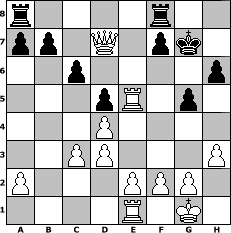 Partie-Notation im PGN-Format [Event "In Memorium Michael Knopf"] [Site "www.mySchach.de"] [Date "2012.04.10"] [Round "1"] [White "Joschi"] [Black "rux"] [ECO "C42"] [WhitemyELO "1637"] [BlackmyELO "1565"] [Result "1-0"] [TimeControl "10/2592000"] [WhiteDays "89"] [BlackDays "52"] [MySchachNr "81124"] 1. e4 e5 2. Nf3 Nf6 3. Nxe5 d6 4. Nf3 Nxe4 5. d4 Be7 6. Nc3 d5 7. Bd3 Nxc3 8. bxc3 h6 9. O-O Bg4 10. h3 Bxf3 11. Qxf3 O-O 12. Bf4 c6 13. Rfe1 Bg5 14. Bxg5 Qxg5 15. Re5 Qd2 16. Qf5 g6 17. Qg4 g5 18. Qf5 Qxd3 19. cxd3 Kg7 20. Re1 Nd7 21. Qxd7 1-0 Stellungs-Notation im FEN-Format r4r2/pp1Q1pk1/2p4p/3pR1p1/3P4/2PP3P/P3PPP1/4R1K1 - - - 0 21 Geschlagene Figuren Weiss: Geschlagene Figuren Schwarz: Klicken Sie auf eine geschlagene Figur um den gewünschten Zug darzustellen!