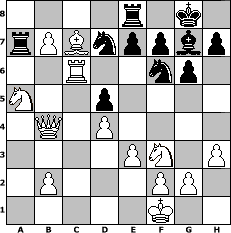 Partie-Notation im PGN-Format [Event "°°°°°Auf den Fr"] [Site "www.mySchach.de"] [Date "2009.04.05"] [Round "1"] [White "Tomino"] [Black "Joschi"] [ECO "A48"] [WhitemyELO "1688"] [BlackmyELO "1567"] [Result "1-0"] [TimeControl "10/864000"] [WhiteDays "08"] [BlackDays "30"] [MySchachNr "54513"] 1. d4 Nf6 2. Nf3 g6 3. Bf4 Bg7 4. e3 d5 5. Be2 O-O 6. O-O Nbd7 7. Nbd2 c5 8. c3 a6 9. h3 b5 10. a4 b4 11. cxb4 cxb4 12. Rc1 Nh5 13. Bh2 a5 14. Bc7 Qe8 15. Nb3 Bb7 16. Nxa5 Ba6 17. Bb5 Bxb5 18. axb5 Qc8 19. Qb3 Nhf6 20. Qxb4 Re8 21. b6 Qa6 22. b7 Ra7 23. Rc6 Qxf1+ 24. Kxf1 1-0 Stellungs-Notation im FEN-Format 4r1k1/rPBnppbp/2R2np1/N2p4/1Q1P4/4PN1P/1P3PP1/5K2 - - - 0 24 Geschlagene Figuren Weiss: Geschlagene Figuren Schwarz: Klicken Sie auf eine geschlagene Figur um den gewünschten Zug darzustellen!