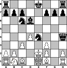 Partie-Notation im PGN-Format [Event "Ostern 2011"] [Site "www.mySchach.de"] [Date "2011.03.18"] [Round "1"] [White "Vahl1"] [Black "Sanji"] [ECO "A02"] [WhitemyELO "1632"] [BlackmyELO "1519"] [Result "1-0"] [TimeControl "10/2592000"] [WhiteDays "44"] [BlackDays "00"] [MySchachNr "72786"] 1. f4 e5 2. fxe5 d6 3. Nf3 Bg4 4. exd6 Bxd6 5. e4 Bxf3 6. gxf3 Qh4+ 7. Ke2 Nc6 8. c3 Nf6 9. d4 Nxe4 10. Qe1 1-0 Stellungs-Notation im FEN-Format r3k2r/ppp2ppp/2nb4/8/3Pn2q/2P2P2/PP2KP1P/RNB1QB1R - kq - 1 10 Geschlagene Figuren Weiss: Geschlagene Figuren Schwarz: Klicken Sie auf eine geschlagene Figur um den gewünschten Zug darzustellen!