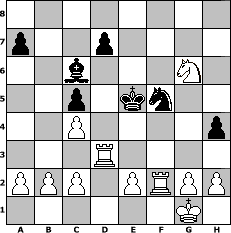 Partie-Notation im PGN-Format [Event "1. Mannschaftsturnier 2004"] [Site "www.mySchach.de"] [Date "2004.11.16"] [Round "1"] [Board "4"] [White "overkamp"] [Black "Matthias"] [ECO "B00"] [WhitemyELO "1518"] [BlackmyELO "1413"] [Result "1-0"] [TimeControl "10/2592000"] [WhiteDays "117"] [BlackDays "113"] [MySchachNr "8038"] 1. e4 Nc6 2. Bc4 Ne5 3. d3 e6 4. Nf3 Nxc4 5. dxc4 Bc5 6. O-O b6 7. Nc3 f6 8. e5 f5 9. Bg5 Be7 10. Bxe7 Qxe7 11. Nb5 Qc5 12. Qd4 Bb7 13. Qxc5 bxc5 14. Nxc7+ Kd8 15. Nxa8 Bxa8 16. Ng5 Nh6 17. Rad1 Bc6 18. Nxe6+ Ke7 19. Nxg7 f4 20. f3 Rg8 21. Nh5 Rg5 22. Nxf4 Nf5 23. Rde1 h5 24. Nd5+ Ke6 25. f4 Rg6 26. Nc7+ Ke7 27. Nd5+ Kf7 28. Rf2 Ke6 29. Rd1 h4 30. Rd3 Nd4 31. f5+ Nxf5 32. Nf4+ Kxe5 33. Nxg6+ 1-0 Stellungs-Notation im FEN-Format 8/p2p4/2b3N1/2p1kn2/2P4p/3R4/PPP1PRPP/6K1 - - - 0 33 Geschlagene Figuren Weiss: Geschlagene Figuren Schwarz: Klicken Sie auf eine geschlagene Figur um den gewünschten Zug darzustellen!