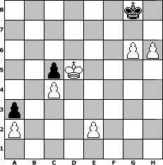 Partie-Notation im PGN-Format [Event "Trainingslager II"] [Site "www.mySchach.de"] [Date "2011.05.24"] [Round "1"] [White "augustus"] [Black "Master1"] [ECO "C44"] [WhitemyELO "1236"] [BlackmyELO "1331"] [Result "1-0"] [TimeControl "10/1728000"] [WhiteDays "20"] [BlackDays "20"] [MySchachNr "74129"] 1. e4 e5 2. Nf3 Nc6 3. c3 Nf6 4. Bc4 Bc5 5. O-O O-O 6. d3 d6 7. Bg5 a6 8. Nbd2 Re8 9. b4 Be6 10. Bxe6 Rxe6 11. bxc5 d5 12. Rb1 d4 13. c4 Rb8 14. Nh4 h6 15. Bxf6 Rxf6 16. Qg4 Ne7 17. Ndf3 Rf4 18. Qh5 b6 19. Qxe5 Rf6 20. Qg3 bxc5 21. e5 Re6 22. Nd2 Ng6 23. Rxb8 Qxb8 24. Ne4 Nxh4 25. Qxh4 Rxe5 26. f4 Rf5 27. h3 Qe8 28. Rf3 Qf8 29. g4 g5 30. Qf2 Rxf4 31. Rxf4 gxf4 32. Qxf4 c6 33. Qf5 Kg7 34. g5 h5 35. Nf6 Qh8 36. Qxc5 Kg6 37. h4 Qc8 38. Qxd4 c5 39. Qe4+ Qf5 40. Nxh5 Qxe4 41. dxe4 Kxh5 42. e5 Kg6 43. Kg2 Kf5 44. Kf3 Kxe5 45. Kg4 Ke6 46. h5 f5+ 47. Kf4 a5 48. h6 Kf7 49. Kxf5 a4 50. g6+ Kg8 51. Ke5 a3 52. Kd5 1-0 Stellungs-Notation im FEN-Format 6k1/8/6PP/2pK4/2P5/p7/P3P3/8 - - - 1 52 Geschlagene Figuren Weiss: Geschlagene Figuren Schwarz: Klicken Sie auf eine geschlagene Figur um den gewünschten Zug darzustellen!
