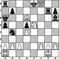 | Partie-Notation im PGN-Format [Event "Herbst Open 2014"] [Site "www.mySchach.de"] [Date "2014.09.23"] [Round "1"] [White "Knight"] [Black "Hobbykegler"] [ECO "D00"] [WhitemyELO "1336"] [BlackmyELO "1069"] [Result "1-0"] [TimeControl "10/3456000"] [WhiteDays "40"] [BlackDays "16"] [MySchachNr "96011"] 1. d4 d5 2. e4 Nf6 3. e5 Ne4 4. Nf3 Bf5 5. Bd3 Nc6 6. O-O f6 7. exf6 gxf6 8. Re1 Qd6 9. Nbd2 Nxd2 10. Qxd2 Bxd3 11. Qxd3 Nb4 12. Qf5 a5 13. Bf4 Qa6 14. Bxc7 Bh6 15. Re6 Rg8 16. Qxf6 Rg7 17. Rxe7+ Rxe7 18. Bd6 Rd7 19. Ne5 Rg7 20. Qf8# 1-0 Stellungs-Notation im FEN-Format r3kQ2/1p4rp/q2B3b/p2pN3/1n1P4/8/PPP2PPP/R5K1 - q - 5 20 Geschlagene Figuren Weiss:                              Geschlagene Figuren Schwarz:                               Klicken Sie auf eine geschlagene Figur um den gewünschten Zug darzustellen!