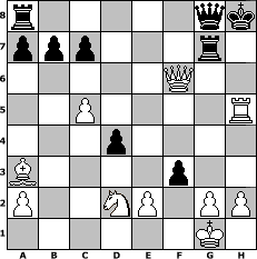 | Partie-Notation im PGN-Format [Event "Abwrackturnier"] [Site "www.mySchach.de"] [Date "2009.04.16"] [Round "1"] [White "reisender"] [Black "Knight"] [ECO "C50"] [WhitemyELO "1379"] [BlackmyELO "1064"] [Result "1-0"] [TimeControl "10/864000"] [WhiteDays "40"] [BlackDays "28"] [MySchachNr "54919"] 1. e4 e5 2. Nf3 Nc6 3. Bc4 h6 4. O-O Nf6 5. d4 exd4 6. Re1 Bc5 7. e5 Ng4 8. Nxd4 Nxf2 9. Qf3 O-O 10. Qxf2 Bxd4 11. Be3 Bxb2 12. Nd2 Bxa1 13. Rxa1 d5 14. Qg3 g5 15. Bb3 f5 16. Bc5 Rf7 17. c4 d4 18. Qh3 Rh7 19. Rf1 Nxe5 20. Ba3 f4 21. c5+ Kh8 22. Be6 Bxe6 23. Qxe6 Qe8 24. Qf6+ Rg7 25. Qxh6+ Rh7 26. Qxg5 f3 27. Re1 Re7 28. Qf6+ Rg7 29. Rxe5 Qg8 30. Rh5+ 1-0 Stellungs-Notation im FEN-Format r5qk/ppp3r1/5Q2/2P4R/3p4/B4p2/P2NP1PP/6K1 - - - 2 30 Geschlagene Figuren Weiss:                              Geschlagene Figuren Schwarz:                               Klicken Sie auf eine geschlagene Figur um den gewünschten Zug darzustellen!