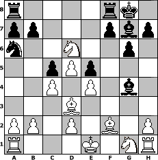 Partie-Notation im PGN-Format [Event "?"] [Site "www.mySchach.de"] [Date "2023.04.19"] [Round "?"] [White "pillepalle"] [Black "kalle"] [ECO "A45"] [WhitemyELO "2027"] [BlackmyELO "1622"] [Result "1-0"] [TimeControl "10/1728000"] [WhiteDays "38"] [BlackDays "36"] [MySchachNr "129857"] 1. d4 Nf6 2. f3 c5 3. d5 d6 4. e4 e6 5. c4 e5 6. Nc3 g6 7. Be3 Bg7 8. Bd3 O-O 9. g4 Nxg4 10. fxg4 Qh4+ 11. Bf2 Qxg4 12. Qxg4 Bxg4 13. Nb5 Na6 14. Nxd6 1-0 Stellungs-Notation im FEN-Format r4rk1/pp3pbp/n2N2p1/2pPp3/2P1P1b1/3B4/PP1P1B1P/R3K1NR - KQ - 0 14 Geschlagene Figuren Weiss: Geschlagene Figuren Schwarz: Klicken Sie auf eine geschlagene Figur um den gewünschten Zug darzustellen!