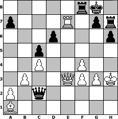 Partie-Notation im PGN-Format [Event "Siebenschl"] [Site "www.mySchach.de"] [Date "2009.07.07"] [Round "1"] [White "RashimIbenRohal"] [Black "rikilatic"] [Variant "Fischerrandom"] [SetUp "1"] [FEN "bqnbnrkr/pppppppp/8/8/8/8/PPPPPPPP/BQNBNRKR w KQkq - 0 1"] [WhitemyELO "1522"] [BlackmyELO "1445"] [Result "1/2-1/2"] [TimeControl "10/2592000"] [WhiteDays "103"] [BlackDays "089"] [MySchachNr "57241"] 1. d4 b6 2. Nf3 Qb7 3. Nd3 Ncd6 4. b3 e6 5. e3 Ne4 6. Qc1 Ng5 7. Nde5 Nf6 8. h4 Nge4 9. c4 d6 10. Nd3 Nh5 11. Rh2 h6 12. Nf4 Nxf4 13. exf4 f6 14. Re1 c5 15. dxc5 bxc5 16. Bc2 f5 17. Nd2 Bxh4 18. Nxe4 fxe4 19. Bxe4 Qe7 20. Bxa8 Rxa8 21. Rxh4 Qxh4 22. Rxe6 Rd8 23. g3 Qg4 24. Re7 Rh7 25. Kg2 Rf8 26. f3 Qg6 27. Qe3 Qc2+ 28. Kh3 Qf5+ 29. Kg2 Qc2+ 30. Kh3 Qf5+ 31. Kg2 Qc2+ 32. Kh3 1/2-1/2 Stellungs-Notation im FEN-Format 5rk1/p3R1pr/3p3p/2p5/2P2P2/1P2QPPK/P1q5/B7 - - - 12 32 Geschlagene Figuren Weiss: Geschlagene Figuren Schwarz: Klicken Sie auf eine geschlagene Figur um den gewünschten Zug darzustellen!