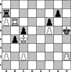 Partie-Notation im PGN-Format [Event "Trainingslager II"] [Site "www.mySchach.de"] [Date "2011.05.24"] [Round "1"] [White "Lemmi11"] [Black "Vahl1"] [ECO "C42"] [WhitemyELO "1706"] [BlackmyELO "1609"] [Result "1-0"] [TimeControl "10/1728000"] [WhiteDays "20"] [BlackDays "20"] [MySchachNr "74092"] 1. e4 e5 2. Nf3 Nf6 3. Nxe5 d6 4. Nf3 Nxe4 5. Qe2 Qe7 6. Nc3 Nxc3 7. dxc3 Qxe2+ 8. Bxe2 Nc6 9. Bf4 Bf5 10. O-O-O Be7 11. Rhe1 a6 12. Bc4 O-O 13. Nd4 Nxd4 14. cxd4 Rfe8 15. f3 h6 16. Kd2 Rad8 17. Re2 b5 18. Bd5 Bf6 19. Rxe8+ Rxe8 20. Bc6 Rb8 21. g4 Bc8 22. Re1 Bb7 23. Bxb7 Rxb7 24. Re8+ Kh7 25. Kd3 Kg6 26. b4 Ra7 27. Bd2 a5 28. bxa5 c5 29. Rb8 b4 30. dxc5 dxc5 31. Rb5 Rd7+ 32. Ke2 Bd4 33. Rb6+ f6 34. a6 Ra7 35. f4 Kh7 36. f5 Bg1 37. Be3 Bxe3 38. Kxe3 h5 39. gxh5 Kh6 40. Kd3 Kxh5 41. Kc4 1-0 Stellungs-Notation im FEN-Format 8/r5p1/PR3p2/2p2P1k/1pK5/8/P1P4P/8 - - - 1 41 Geschlagene Figuren Weiss: Geschlagene Figuren Schwarz: Klicken Sie auf eine geschlagene Figur um den gewünschten Zug darzustellen!