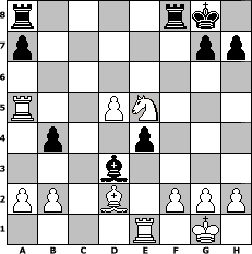 Partie-Notation im PGN-Format [Event "Gegen die Herbstdepression"] [Site "www.mySchach.de"] [Date "2008.12.01"] [Round "1"] [White "neve"] [Black "rux"] [ECO "D06"] [WhitemyELO "1447"] [BlackmyELO "1378"] [Result "1-0"] [TimeControl "10/864000"] [WhiteDays "10"] [BlackDays "10"] [MySchachNr "50342"] 1. d4 d5 2. c4 Nf6 3. cxd5 Nxd5 4. e4 Nf6 5. Nc3 e5 6. d5 Bb4 7. Qa4+ Nfd7 8. Qxb4 c5 9. Qa3 O-O 10. Nf3 Qb6 11. Be3 Na6 12. Bxa6 bxa6 13. O-O Qb4 14. Qxb4 cxb4 15. Na4 a5 16. Rac1 Ba6 17. Rfe1 f6 18. Nc5 Nxc5 19. Rxc5 Bd3 20. Bd2 f5 21. Nxe5 fxe4 22. Rxa5 1-0 Stellungs-Notation im FEN-Format r4rk1/p5pp/8/R2PN3/1p2p3/3b4/PP1B1PPP/4R1K1 - - - 0 22 Geschlagene Figuren Weiss: Geschlagene Figuren Schwarz: Klicken Sie auf eine geschlagene Figur um den gewünschten Zug darzustellen!