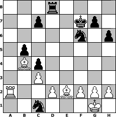 Partie-Notation im PGN-Format [Event "Fr"] [Site "www.mySchach.de"] [Date "2008.01.28"] [Round "1"] [White "reisinger"] [Black "Greenhorn"] [ECO "D31"] [WhitemyELO "1473"] [BlackmyELO "1561"] [Result "0-1"] [TimeControl "10/1728000"] [WhiteDays "20"] [BlackDays "20"] [MySchachNr "42012"] 1. d4 d5 2. c4 e6 3. Nc3 Bb4 4. Qc2 Nf6 5. a3 Bxc3+ 6. bxc3 dxc4 7. e4 b5 8. Nf3 Bb7 9. e5 Nfd7 10. Rb1 a6 11. a4 Bc6 12. axb5 axb5 13. Be2 O-O 14. O-O f6 15. exf6 Nxf6 16. Ng5 h6 17. Nxe6 Be4 18. Nxd8 Bxc2 19. Rb2 Rxd8 20. Rxc2 Nc6 21. Bf3 Ra6 22. Re1 Kf8 23. Re6 Nxd4 24. Rxa6 Nxc2 25. Ra2 Ne1 26. Be2 Nd3 27. Ba3+ Kf7 28. Bb4 Nc1 0-1 Stellungs-Notation im FEN-Format 3r4/2p2kp1/5n1p/1p6/1Bp5/2P5/R2PBPPP/2n3K1 - - - 8 29 Geschlagene Figuren Weiss: ![]() ![]() ![]() ![]() ![]() ![]() ![]() ![]() ![]() ![]() ![]() ![]() ![]() ![]() ![]() Geschlagene Figuren Schwarz: ![]() ![]() ![]() ![]() ![]() ![]() ![]() ![]() ![]() ![]() ![]() ![]() ![]() ![]() ![]() Klicken Sie auf eine geschlagene Figur um den gewünschten Zug darzustellen!