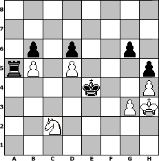 Partie-Notation im PGN-Format [Event "2014-1.0"] [Site "www.mySchach.de"] [Date "2014.01.05"] [Round "1"] [White "lotchi"] [Black "Seneca"] [ECO "A04"] [WhitemyELO "1160"] [BlackmyELO "1574"] [Result "0-1"] [TimeControl "10/2592000"] [WhiteDays "120"] [BlackDays "128"] [MySchachNr "92131"] 1. Nf3 Nc6 2. Nc3 d6 3. e4 Nf6 4. Bb5 Bd7 5. d3 g6 6. Bg5 Bg7 7. O-O O-O 8. a4 a6 9. Bxc6 Bxc6 10. Bxf6 Bxf6 11. Qd2 e5 12. Nd5 Bg7 13. b3 Bxd5 14. exd5 e4 15. dxe4 Bxa1 16. Rxa1 Qf6 17. c3 Rae8 18. Re1 Re7 19. Qd4 Qxd4 20. Nxd4 Rfe8 21. f3 Re5 22. b4 f5 23. Ne6 Re7 24. c4 fxe4 25. fxe4 b6 26. b5 axb5 27. cxb5 h6 28. h4 Rf7 29. Nd4 Rf4 30. Ne6 Rfxe4 31. Rf1 Re1 32. Nxc7 Rxf1+ 33. Kxf1 Re4 34. g3 Rxa4 35. Kg2 Kf7 36. Kh3 Kf6 37. Ne8+ Ke5 38. Nc7 Ra7 39. Ne6 Ra3 40. Nf4 Kf5 41. Ne6 h5 42. Nd4+ Ke4 43. Nc2 Ra5 0-1 Stellungs-Notation im FEN-Format 8/8/1p1p2p1/rP1P3p/4k2P/6PK/2N5/8 - - - 4 44 Geschlagene Figuren Weiss: Geschlagene Figuren Schwarz: Klicken Sie auf eine geschlagene Figur um den gewünschten Zug darzustellen!