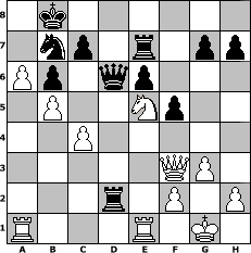 Partie-Notation im PGN-Format [Event "Sommerturnier 2"] [Site "www.mySchach.de"] [Date "2011.07.17"] [Round "1"] [White "Winston"] [Black "Ziegert"] [ECO "B03"] [WhitemyELO "1440"] [BlackmyELO "1500"] [Result "1-0"] [TimeControl "10/1728000"] [WhiteDays "19"] [BlackDays "17"] [MySchachNr "75107"] 1. e4 Nf6 2. e5 Nd5 3. d4 d6 4. Bc4 Nb6 5. Bb3 dxe5 6. Qf3 e6 7. dxe5 Nc6 8. Qg3 a5 9. c3 a4 10. Bc2 Qd5 11. Nf3 Bd7 12. O-O O-O-O 13. Be3 Nc4 14. Ng5 N6xe5 15. b3 Nxe3 16. Qxe3 Bc6 17. Be4 Qd7 18. Qa7 b6 19. Bxc6 Nxc6 20. Qxa4 f6 21. Nf3 Kb7 22. Nbd2 Ra8 23. Qe4 Kb8 24. a4 f5 25. Qe2 Ra5 26. Rfd1 Bd6 27. Nc4 Rd5 28. Re1 Re8 29. b4 Bf4 30. b5 Nd8 31. g3 Bd6 32. Nxd6 Qxd6 33. c4 Rd3 34. Ne5 Rd2 35. Qf3 Re7 36. a5 Nb7 37. a6 1-0 Stellungs-Notation im FEN-Format 1k6/1np1r1pp/Pp1qp3/1P2Np2/2P5/5QP1/3r1P1P/R3R1K1 - - - 0 37 Geschlagene Figuren Weiss: Geschlagene Figuren Schwarz: Klicken Sie auf eine geschlagene Figur um den gewünschten Zug darzustellen!