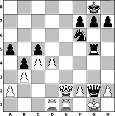 Partie-Notation im PGN-Format [Event "unter uns Nr. 30 (Weihnachtsturnier)"] [Site "www.mySchach.de"] [Date "2015.12.21"] [Round "2"] [White "Master1"] [Black "Mattheus"] [ECO "D00"] [WhitemyELO "1260"] [BlackmyELO "1163"] [Result "0-1"] [TimeControl "10/2592000"] [WhiteDays "84"] [BlackDays "90"] [MySchachNr "101767"] 1. d4 d5 2. e3 Nc6 3. Bd3 Nf6 4. Nf3 Bg4 5. O-O e5 6. dxe5 Nxe5 7. Nbd2 Bd6 8. Re1 O-O 9. Be2 Bxf3 10. Nxf3 Re8 11. b3 a6 12. Bb2 c5 13. Nxe5 Bxe5 14. Bxe5 Rxe5 15. Bf3 b5 16. c3 a5 17. Qe2 b4 18. c4 d4 19. Bxa8 Qxa8 20. Rad1 Rg5 21. exd4 Qxg2# 0-1 Stellungs-Notation im FEN-Format 6k1/5ppp/5n2/p1p3r1/1pPP4/1P6/P3QPqP/3RR1K1 - - - 0 22 Geschlagene Figuren Weiss: Geschlagene Figuren Schwarz: Klicken Sie auf eine geschlagene Figur um den gewünschten Zug darzustellen!