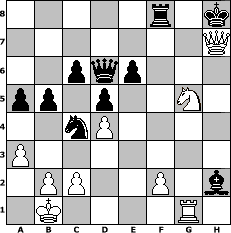 Partie-Notation im PGN-Format [Event "Turnier in den M"] [Site "www.mySchach.de"] [Date "2014.02.19"] [Round "1"] [White "hape50"] [Black "borsti"] [ECO "D00"] [WhitemyELO "1284"] [BlackmyELO "1229"] [Result "1-0"] [TimeControl "10/2592000"] [WhiteDays "30"] [BlackDays "30"] [MySchachNr "93066"] 1. d4 d5 2. h3 Nc6 3. e3 a6 4. Nf3 Bf5 5. a3 e6 6. Bd3 Bxd3 7. Qxd3 Bd6 8. Nc3 Nf6 9. Bd2 O-O 10. g4 b5 11. O-O-O Na5 12. g5 Nh5 13. e4 Nf4 14. Bxf4 Bxf4+ 15. Kb1 Nc4 16. e5 Bxg5 17. h4 Bh6 18. Rhg1 c6 19. Ne2 a5 20. Rg2 Kh8 21. Neg1 f5 22. exf6 Qxf6 23. Nh2 Qxh4 24. Ngf3 Qf4 25. Rg4 Qd6 26. Rh1 Ra7 27. Rhg1 Bf4 28. Rh4 g5 29. Nxg5 Bxh2 30. Rxh7+ Rxh7 31. Qxh7# 1-0 Stellungs-Notation im FEN-Format 5r1k/7Q/2pqp3/pp1p2N1/2nP4/P7/1PP2P1b/1K4R1 - - - 0 31 Geschlagene Figuren Weiss: Geschlagene Figuren Schwarz: Klicken Sie auf eine geschlagene Figur um den gewünschten Zug darzustellen!