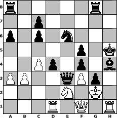 Partie-Notation im PGN-Format [Event "f"] [Site "www.mySchach.de"] [Date "2008.04.14"] [Round "1"] [White "steff"] [Black "DreiZweiEinsSchach"] [ECO "C48"] [WhitemyELO "1194"] [BlackmyELO "1298"] [Result "0-1"] [TimeControl "10/864000"] [WhiteDays "34"] [BlackDays "12"] [MySchachNr "44269"] 1. e4 e5 2. Nf3 Nc6 3. Nc3 Nf6 4. Bb5 d6 5. d3 Bg4 6. O-O a6 7. Bxc6+ bxc6 8. Bg5 Be7 9. Na4 Bxf3 10. gxf3 O-O 11. f4 h6 12. Bh4 exf4 13. h3 Qd7 14. Qf3 g5 15. Bxg5 hxg5 16. b3 Kg7 17. Rfe1 Nh7 18. Kh2 f5 19. e5 d5 20. d4 Kg6 21. Rg1 Rg8 22. h4 g4 23. Qh3 Kh5 24. Qf1 Nf8 25. f3 g3+ 26. Kg2 Bxh4 27. Rh1 Ne6 28. Nc3 Nxd4 29. Rc1 Ne6 30. a3 d4 31. Ne2 Qd5 32. c4 Qxe5 33. Rd1 Qe3 0-1 Stellungs-Notation im FEN-Format r5r1/2p5/p1p1n3/5p1k/2Pp1p1b/PP2qPp1/4N1K1/3R1Q1R - - - 2 34 Geschlagene Figuren Weiss: Geschlagene Figuren Schwarz: Klicken Sie auf eine geschlagene Figur um den gewünschten Zug darzustellen!