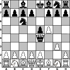 Partie-Notation im PGN-Format [Event "Trainingslager II"] [Site "www.mySchach.de"] [Date "2011.05.24"] [Round "1"] [White "micha62"] [Black "Master1"] [ECO "C30"] [WhitemyELO "1165"] [BlackmyELO "1331"] [Result "0-1"] [TimeControl "10/1728000"] [WhiteDays "00"] [BlackDays "17"] [MySchachNr "74089"] 1. e4 e5 2. f4 Nc6 3. f5 Qh4+ 4. g3 Qxe4+ 0-1 Stellungs-Notation im FEN-Format r1b1kbnr/pppp1ppp/2n5/4pP2/4q3/6P1/PPPPP2P/RNBQKBNR - KQkq - 0 5 Geschlagene Figuren Weiss: Geschlagene Figuren Schwarz: Klicken Sie auf eine geschlagene Figur um den gewünschten Zug darzustellen!