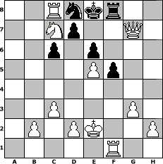 Partie-Notation im PGN-Format [Event "960 Chess Fun"] [Site "www.mySchach.de"] [Date "2006.03.14"] [Round "1"] [White "crca108"] [Black "Jolilein"] [Variant "Fischerrandom"] [SetUp "1"] [FEN "nrnqkrbb/pppppppp/8/8/8/8/PPPPPPPP/NRNQKRBB w KQkq - 0 1"] [WhitemyELO "1408"] [BlackmyELO "1380"] [Result "1-0"] [TimeControl "10/864000"] [WhiteDays "10"] [BlackDays "10"] [MySchachNr "23560"] 1. Nab3 h5 2. g3 Nd6 3. f4 Nb5 4. e4 Nd6 5. Bxa7 Bh7 6. Bxb8 Qxb8 7. Qxh5 Bxe4 8. Bxe4 Nxe4 9. Nd3 Qa7 10. Ke2 c6 11. Qg4 g6 12. c3 Qxa2 13. Ra1 f5 14. Qxg6+ Rf7 15. Rxa2 Nb6 16. Ra7 e6 17. Rxb7 Nc8 18. Rb8 Ned6 19. Qg8+ Rf8 20. Qg6+ Kd8 21. Nbc5 Kc7 22. Na6+ Kd8 23. Ne5 Bxe5 24. fxe5 Nf7 25. Qg7 Ke8 26. Rxc8+ Nd8 27. Nc7# 1-0 Stellungs-Notation im FEN-Format 2Rnkr2/2Np2Q1/2p1p3/4Pp2/8/2P3P1/1P1PK2P/5R2 - - - 2 27 Geschlagene Figuren Weiss: Geschlagene Figuren Schwarz: Klicken Sie auf eine geschlagene Figur um den gewünschten Zug darzustellen!
