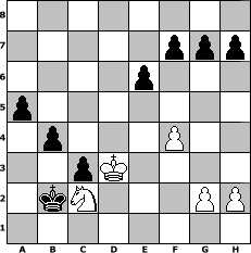 Partie-Notation im PGN-Format [Event "JN OPEN 40/10 1"] [Site "www.mySchach.de"] [Date "2016.01.25"] [Round "1"] [White "Schefsche"] [Black "Joschi"] [ECO "B12"] [WhitemyELO "1523"] [BlackmyELO "1527"] [Result "0-1"] [TimeControl "10/3456000"] [WhiteDays "35"] [BlackDays "40"] [MySchachNr "102209"] 1. e4 c6 2. d4 d5 3. e5 Bf5 4. Bd3 Bxd3 5. Qxd3 e6 6. Nf3 Nd7 7. Bg5 Ne7 8. O-O Rc8 9. c4 Qb6 10. b3 c5 11. Nc3 cxd4 12. Bxe7 dxc3 13. Bxf8 dxc4 14. Qd6 Rxf8 15. Rfd1 Qxd6 16. Rxd6 cxb3 17. axb3 a6 18. Ne1 Nxe5 19. Rc1 Ke7 20. Rb6 Rc7 21. Nc2 Nd3 22. Rd1 Rd8 23. Kf1 Nb2 24. Rxd8 Kxd8 25. Rd6+ Rd7 26. Rxd7+ Kxd7 27. Ke2 b5 28. b4 Kd6 29. Ke3 Kd5 30. f4 Kc4 31. Ke4 Nd3 32. Ne3+ Kxb4 33. Kxd3 Kb3 34. Nc2 a5 35. Nd4+ Kb4 36. Nc2+ Kb3 37. Nd4+ Kb2 38. Nc2 b4 0-1 Stellungs-Notation im FEN-Format 8/5ppp/4p3/p7/1p3P2/2pK4/1kN3PP/8 - - - 0 39 Geschlagene Figuren Weiss: ![]() ![]() ![]() ![]() ![]() ![]() ![]() ![]() ![]() ![]() ![]() ![]() ![]() ![]() ![]() Geschlagene Figuren Schwarz: ![]() ![]() ![]() ![]() ![]() ![]() ![]() ![]() ![]() ![]() ![]() ![]() ![]() ![]() ![]() Klicken Sie auf eine geschlagene Figur um den gewünschten Zug darzustellen!