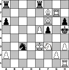 Partie-Notation im PGN-Format [Event "Abermals Aljechin"] [Site "www.mySchach.de"] [Date "2011.02.13"] [Round "1"] [White "Svetlana"] [Black "Schefsche"] [ECO "A52"] [WhitemyELO "1586"] [BlackmyELO "1361"] [Result "1-0"] [TimeControl "10/1728000"] [WhiteDays "58"] [BlackDays "51"] [MySchachNr "71967"] 1. d4 Nf6 2. c4 e5 3. dxe5 Ng4 4. e4 d6 5. exd6 Bxd6 6. Be2 Bb4+ 7. Bd2 Nxf2 8. Kxf2 Qf6+ 9. Nf3 Bc5+ 10. Kf1 Bg4 11. Bg5 Qd6 12. Nc3 O-O 13. Qxd6 Bxd6 14. Nb5 a6 15. Nxd6 cxd6 16. h3 Be6 17. Kf2 Nc6 18. Rad1 h6 19. Bh4 Ne5 20. Rxd6 Nxc4 21. Rxe6 Nxb2 22. Rb6 Na4 23. Rxb7 Nc3 24. Ke3 Rfe8 25. Bc4 Kh7 26. e5 f5 27. Bf6 Kg6 28. Rxg7+ Kh5 29. Bf7# 1-0 Stellungs-Notation im FEN-Format r3r3/5BR1/p4B1p/4Pp1k/8/2n1KN1P/P5P1/7R - - - 2 29 Geschlagene Figuren Weiss: Geschlagene Figuren Schwarz: Klicken Sie auf eine geschlagene Figur um den gewünschten Zug darzustellen!