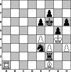 Partie-Notation im PGN-Format [Event "Herbst-Turnier 2005"] [Site "www.mySchach.de"] [Date "2005.11.15"] [Round "2"] [White "nogumo"] [Black "Andreschach (adv.)"] [ECO "A00"] [WhitemyELO "1803"] [BlackmyELO "1758"] [Result "0-1"] [TimeControl "10/2592000"] [WhiteDays "109"] [BlackDays "083"] [MySchachNr "19626"] 1. b4 Nf6 2. Bb2 e6 3. b5 b6 4. e3 Bb7 5. Nf3 Be7 6. Be2 O-O 7. O-O d6 8. c4 a6 9. a4 axb5 10. axb5 Rxa1 11. Bxa1 d5 12. Qc2 dxc4 13. Qxc4 c6 14. Nc3 cxb5 15. Nxb5 Nbd7 16. Rb1 Qb8 17. Bd4 Rc8 18. Qa2 Bd5 19. Qa7 Qxa7 20. Nxa7 Rc2 21. Bd3 Ra2 22. Nc8 Bc5 23. Nxb6 Bxb6 24. Bxb6 Bxf3 25. gxf3 Rxd2 26. Bf1 Nxb6 27. Rxb6 g5 28. h3 Kg7 29. Rb5 h6 30. Ra5 Nd7 31. Kg2 Kf6 32. Ba6 Ne5 33. Bf1 Ng6 34. Ra1 Nh4+ 35. Kg3 Nf5+ 36. Kg4 Rxf2 37. e4 Ne3+ 0-1 Stellungs-Notation im FEN-Format 8/5p2/4pk1p/6p1/4P1K1/4nP1P/5r2/R4B2 - - - 1 38 Geschlagene Figuren Weiss: Geschlagene Figuren Schwarz: Klicken Sie auf eine geschlagene Figur um den gewünschten Zug darzustellen!