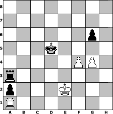 Partie-Notation im PGN-Format [Event "Ihr kinderlein kommet"] [Site "www.mySchach.de"] [Date "2012.12.08"] [Round "1"] [White "grazy"] [Black "Erich"] [ECO "C68"] [WhitemyELO "1800"] [BlackmyELO "1968"] [Result "0-1"] [TimeControl "10/2592000"] [WhiteDays "233"] [BlackDays "240"] [MySchachNr "85397"] 1. e4 e5 2. Nf3 Nc6 3. Bb5 a6 4. Bxc6 dxc6 5. O-O Bg4 6. h3 Bh5 7. d3 Bd6 8. Nbd2 Ne7 9. Nc4 f6 10. Be3 O-O 11. a3 f5 12. exf5 Nxf5 13. g4 Nh4 14. Nfd2 Bf7 15. Nxd6 cxd6 16. f3 Ng6 17. Qe2 Bd5 18. Rae1 c5 19. Ne4 Nf4 20. Bxf4 Rxf4 21. Kh2 Qe7 22. b4 cxb4 23. axb4 Raf8 24. c4 Bc6 25. Kg2 h5 26. Rf2 Qd8 27. Rc1 Qh4 28. Ra1 Kh8 29. Rff1 Qd8 30. Rac1 Qd7 31. Rf2 Qe7 32. Qc2 Qh4 33. Rff1 Kg8 34. Qd1 Bd7 35. Qe1 Qe7 36. Qe2 Bc6 37. Rf2 Qd8 38. Rff1 Kh8 39. Rc3 Qb6 40. c5 Qxb4 41. Rc4 Qa3 42. cxd6 Bxe4 43. Rxe4 Rxe4 44. Qxe4 Qxd6 45. Qxb7 Qxd3 46. Rf2 Qc4 47. Qe7 Qf4 48. Qh4 g6 49. Qg3 Qxg3+ 50. Kxg3 h4+ 51. Kxh4 e4 52. f4 e3 53. Re2 Re8 54. Kg3 a5 55. Kg2 a4 56. Kf1 a3 57. Ra2 e2+ 58. Ke1 Re3 59. Ra1 Rxh3 60. Kxe2 a2 61. Kd2 Rg3 62. Ke2 Kg7 63. Kf1 Rf3+ 64. Ke1 Rh3 65. Kd2 Rg3 66. Ke2 Kf6 67. Kf1 Rf3+ 68. Ke2 Rh3 69. Rc1 Ke7 70. Rd1 Rg3 71. Ra1 Kd6 72. Kf1 Ra3 73. Ke2 Kd5 0-1 Stellungs-Notation im FEN-Format 8/8/6p1/3k4/5PP1/r7/p3K3/R7 - - - 26 74 Geschlagene Figuren Weiss: Geschlagene Figuren Schwarz: Klicken Sie auf eine geschlagene Figur um den gewünschten Zug darzustellen!