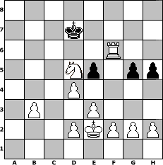 Partie-Notation im PGN-Format [Event "5.Jahreszeit"] [Site "www.mySchach.de"] [Date "2016.11.15"] [Round "1"] [White "FrankB"] [Black "borsti"] [ECO "D02"] [WhitemyELO "1666"] [BlackmyELO "1218"] [Result "1-0"] [TimeControl "10/2592000"] [WhiteDays "117"] [BlackDays "120"] [MySchachNr "105669"] 1. d4 d5 2. Nf3 Bg4 3. Ne5 Bh5 4. c4 Nf6 5. Qb3 Nbd7 6. Nxd7 Nxd7 7. Qxb7 Nb6 8. c5 Rb8 9. Qxa7 c6 10. cxb6 Qxb6 11. Qxb6 Rxb6 12. Nc3 e6 13. Na4 Rb4 14. b3 Bd6 15. e3 O-O 16. Ba3 Rfb8 17. Be2 Bxe2 18. Bxb4 Bxb4+ 19. Kxe2 g5 20. Rac1 Rc8 21. Rc2 Ba3 22. Nb2 Kf8 23. Nd3 Ke7 24. Ne5 f6 25. Nd3 Kd6 26. b4 Rb8 27. Rb1 Ra8 28. Rb3 e5 29. Rcc3 Bxb4 30. Nxb4 Rb8 31. Rxc6+ Kd7 32. Rxf6 h5 33. Nxd5 Rxb3 34. axb3 1-0 Stellungs-Notation im FEN-Format 8/3k4/5R2/3Np1pp/3P4/1P2P3/3PKPPP/8 - - - 0 34 Geschlagene Figuren Weiss: Geschlagene Figuren Schwarz: Klicken Sie auf eine geschlagene Figur um den gewünschten Zug darzustellen!