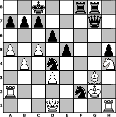 Partie-Notation im PGN-Format [Event "Latvija"] [Site "www.mySchach.de"] [Date "2017.07.03"] [Round "2"] [White "Seneca"] [Black "faustballer"] [ECO "C40"] [WhitemyELO "1502"] [BlackmyELO "1501"] [Result "0-1"] [TimeControl "10/2592000"] [WhiteDays "68"] [BlackDays "88"] [MySchachNr "108798"] 1. e4 e5 2. Nf3 f5 3. exf5 d6 4. d3 Bxf5 5. Be2 g6 6. O-O Bd7 7. Nc3 Be7 8. Nd5 Nf6 9. Nxe7 Qxe7 10. h3 Nc6 11. c3 O-O-O 12. b4 Nb8 13. Bg5 h6 14. Bh4 g5 15. Bg3 Rhg8 16. Nh2 Qh7 17. c4 h5 18. Nf3 g4 19. Nh4 gxh3 20. Bf3 Bg4 21. a4 hxg2 22. Kxg2 Nc6 23. Rh1 Nd4 24. Bxg4+ Nxg4 25. a5 Rdf8 26. Ra2 Qg7 27. c5 Nxf2 0-1 Stellungs-Notation im FEN-Format 2k2rr1/ppp3q1/3p4/P1P1p2p/1P1n3N/3P2B1/R4nK1/3Q3R - - - 0 28 Geschlagene Figuren Weiss: Geschlagene Figuren Schwarz: Klicken Sie auf eine geschlagene Figur um den gewünschten Zug darzustellen!