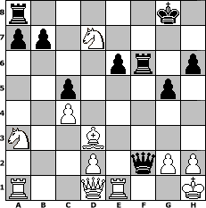 Partie-Notation im PGN-Format [Event "wie w"] [Site "www.mySchach.de"] [Date "2013.11.11"] [Round "1"] [White "Knight"] [Black "MiFie"] [ECO "A40"] [WhitemyELO "1214"] [BlackmyELO "1040"] [Result "1-0"] [TimeControl "10/1728000"] [WhiteDays "20"] [BlackDays "20"] [MySchachNr "91040"] 1. d4 Nc6 2. d5 Nb4 3. a3 e6 4. axb4 Bxb4+ 5. c3 Bd6 6. Nf3 c6 7. dxc6 dxc6 8. e4 Nf6 9. e5 Ne4 10. Bd3 f5 11. exf6 Nxf6 12. O-O O-O 13. Bg5 h6 14. Bh4 Bc5 15. Na3 Qb6 16. b4 Ng4 17. bxc5 Qxc5 18. c4 Bd7 19. Re1 g5 20. Bg3 Rf6 21. Ne5 Nxf2 22. Bxf2 Qxf2+ 23. Kh1 c5 24. Nxd7 1-0 Stellungs-Notation im FEN-Format r5k1/pp1N4/4pr1p/2p3p1/2P5/N2B4/3P1qPP/R2QR2K - - - 0 24 Geschlagene Figuren Weiss: Geschlagene Figuren Schwarz: Klicken Sie auf eine geschlagene Figur um den gewünschten Zug darzustellen!