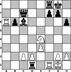 Partie-Notation im PGN-Format [Event "Der Beste hinter den 1900ern(3/10) oder 10 hoch 2"] [Site "www.mySchach.de"] [Date "2010.01.12"] [Round "1"] [White "Knight"] [Black "lasker"] [ECO "D00"] [WhitemyELO "1107"] [BlackmyELO "1351"] [Result "0-1"] [TimeControl "10/864000"] [WhiteDays "09"] [BlackDays "10"] [MySchachNr "62334"] 1. d4 d5 2. e4 e6 3. Nc3 Bb4 4. a3 Bxc3+ 5. bxc3 dxe4 6. Be3 Nc6 7. Bb5 Bd7 8. Ne2 Nge7 9. O-O O-O 10. a4 a6 11. Bxc6 Bxc6 12. a5 h6 13. c4 b6 14. axb6 cxb6 15. Nc3 Qc7 16. d5 exd5 17. cxd5 Rad8 18. Rxa6 Nxd5 19. Nxe4 Nxe3 20. fxe3 Rxd1 0-1 Stellungs-Notation im FEN-Format 5rk1/2q2pp1/Rpb4p/8/4N3/4P3/2PP2PP/3r1RK1 - - - 0 21 Geschlagene Figuren Weiss: Geschlagene Figuren Schwarz: Klicken Sie auf eine geschlagene Figur um den gewünschten Zug darzustellen!