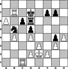 Partie-Notation im PGN-Format [Event "Zur Fastenzeit"] [Site "www.mySchach.de"] [Date "2018.03.15"] [Round "1"] [White "Helmut48"] [Black "miu"] [ECO "E10"] [WhitemyELO "1998"] [BlackmyELO "1518"] [Result "1-0"] [TimeControl "10/3456000"] [WhiteDays "40"] [BlackDays "40"] [MySchachNr "111737"] 1. d4 Nf6 2. c4 e6 3. Nf3 d5 4. Nc3 Bb4 5. cxd5 exd5 6. Bg5 Bf5 7. Qb3 Bxc3+ 8. bxc3 Nbd7 9. Qxb7 Qb8 10. Qb4 Qb6 11. Nh4 Bg6 12. e3 Rb8 13. Nxg6 hxg6 14. Rb1 Rh5 15. h4 Qxb4 16. cxb4 c6 17. Bf4 Rc8 18. Ba6 Rb8 19. Bxb8 Nxb8 20. Be2 Rh6 21. Rb3 g5 22. Ra3 a6 23. g3 g4 24. Bxa6 Nxa6 25. Rxa6 Ne4 26. a4 Rd6 27. a5 Nc3 28. Rb6 Nb5 29. a6 Kd8 30. Ke2 Kc8 31. Rc1 Kd7 32. Rb7+ 1-0 Stellungs-Notation im FEN-Format 8/1R1k1pp1/P1pr4/1n1p4/1P1P2pP/4P1P1/3PKP2/2R5 - - - 6 32 Geschlagene Figuren Weiss: Geschlagene Figuren Schwarz: Klicken Sie auf eine geschlagene Figur um den gewünschten Zug darzustellen!