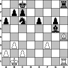Partie eroeffnet am 27.04.2005, 00:00 Uhr und beendet am 30.04.2005, 20:58 Uhr Spieler weiss: Knight Spieler schwarz: Andylein1989 Andylein1989 hat die Partie gewonnen! | |