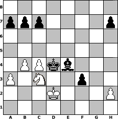 Partie-Notation im PGN-Format [Event "Svetlana Open 2012"] [Site "www.mySchach.de"] [Date "2012.03.22"] [Round "1"] [White "Naunhofer"] [Black "woern63"] [ECO "B01"] [WhitemyELO "1654"] [BlackmyELO "1898"] [Result "0-1"] [TimeControl "10/2592000"] [WhiteDays "30"] [BlackDays "30"] [MySchachNr "80771"] 1. e4 d5 2. exd5 Qxd5 3. c4 Qe4+ 4. Qe2 Qxe2+ 5. Bxe2 Nc6 6. Nc3 Bf5 7. Nf3 e5 8. O-O O-O-O 9. a3 Be7 10. Nd5 e4 11. Ne1 Bd6 12. f3 Nd4 13. Bd1 exf3 14. Bxf3 Be6 15. b4 Nf6 16. Bb2 Be5 17. Bc3 Nxf3+ 18. Rxf3 Bxc3 19. dxc3 Nxd5 20. cxd5 Bxd5 21. Re3 Rhe8 22. Nc2 Rxe3 23. Nxe3 Be4 24. Rd1 Rxd1+ 25. Nxd1 Kd7 26. Kf2 f5 27. g3 Kd6 28. Ke3 Kd5 29. Nb2 g5 30. c4+ Ke5 31. Nd1 f4+ 32. gxf4+ gxf4+ 33. Kd2 Kd4 34. Nc3 f3 0-1 Stellungs-Notation im FEN-Format 8/ppp4p/8/8/1PPkb3/P1N2p2/3K3P/8 - - - 0 35 Geschlagene Figuren Weiss: Geschlagene Figuren Schwarz: Klicken Sie auf eine geschlagene Figur um den gewünschten Zug darzustellen!