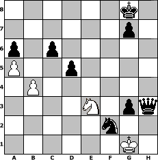 Partie-Notation im PGN-Format [Event "Mail"] [Site "www.mySchach.de"] [Date "2012.05.01"] [Round "1"] [White "alpacino"] [Black "Seneca"] [ECO "C41"] [WhitemyELO "1304"] [BlackmyELO "1353"] [Result "0-1"] [TimeControl "10/864000"] [WhiteDays "09"] [BlackDays "09"] [MySchachNr "81402"] 1. e4 e5 2. Nf3 d6 3. Bc4 Be7 4. Nc3 h6 5. O-O a6 6. Nd5 Bg4 7. Be2 Nf6 8. d3 Nxd5 9. Nd2 Bxe2 10. Qxe2 Nf4 11. Qg4 Ng6 12. Nc4 Bg5 13. Bxg5 Qxg5 14. Qc8+ Qd8 15. Qxb7 Nd7 16. Qb3 O-O 17. c3 Nc5 18. Qd1 Nf4 19. b3 f5 20. exf5 Rxf5 21. d4 exd4 22. cxd4 Nce6 23. Ne3 Rf7 24. d5 Nc5 25. Nc4 Qg5 26. g3 Nxd5 27. Rc1 Re8 28. a3 Ref8 29. b4 Ne4 30. Rc2 Nf4 31. Ne3 Nh3+ 32. Kg2 Nhxf2 33. Qe2 h5 34. Rc4 d5 35. Rxe4 Nxe4 36. Rxf7 Rxf7 37. Kg1 Rf6 38. Qe1 h4 39. a4 hxg3 40. h3 c6 41. Ng4 Rf3 42. a5 Qf5 43. Ne3 Qxh3 44. Qe2 Rf2 45. Qxf2 Nxf2 0-1 Stellungs-Notation im FEN-Format 6k1/6p1/p1p5/P2p4/1P6/4N1pq/5n2/6K1 - - - 0 46 Geschlagene Figuren Weiss: Geschlagene Figuren Schwarz: Klicken Sie auf eine geschlagene Figur um den gewünschten Zug darzustellen!