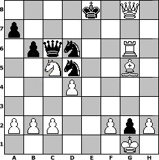 Partie-Notation im PGN-Format [Event "960"] [Site "www.mySchach.de"] [Date "2009.12.20"] [Round "1"] [White "rakl"] [Black "Hobbykegler"] [Variant "Fischerrandom"] [SetUp "1"] [FEN "qrnkbbrn/pppppppp/8/8/8/8/PPPPPPPP/QRNKBBRN w KQkq - 0 1"] [WhitemyELO "1849"] [BlackmyELO "1060"] [Result "1-0"] [TimeControl "10/2592000"] [WhiteDays "90"] [BlackDays "86"] [MySchachNr "61700"] 1. d4 Nb6 2. e4 d5 3. Ng3 dxe4 4. Nxe4 e6 5. Nb3 Bc6 6. Bd3 Be7 7. Bd2 O-O 8. O-O Rbd8 9. Rfe1 f5 10. Nec5 f4 11. Nxe6 f3 12. Nxc7 Qc8 13. Rxe7 fxg2 14. Ne6 Rf7 15. Rxf7 Nxf7 16. Nxd8 Qxd8 17. Re1 Qd5 18. Be4 Qd6 19. Bxc6 Qxc6 20. Qd1 h6 21. Nc5 Nd6 22. Qg4 g5 23. Qh5 Kh7 24. Re6 Nd5 25. Bxg5 b6 26. Qxh6+ Kg8 27. Rg6+ Kf7 28. Qg7+ Ke8 29. Qg8# 1-0 Stellungs-Notation im FEN-Format 4k1Q1/p7/1pqn2R1/2Nn2B1/3P4/8/PPP2PpP/6K1 - - - 6 29 Geschlagene Figuren Weiss: Geschlagene Figuren Schwarz: Klicken Sie auf eine geschlagene Figur um den gewünschten Zug darzustellen!