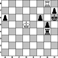 Partie-Notation im PGN-Format [Event "Turnier in den M"] [Site "www.mySchach.de"] [Date "2014.02.19"] [Round "1"] [White "hape50"] [Black "Macks"] [ECO "A45"] [WhitemyELO "1284"] [BlackmyELO "1372"] [Result "0-1"] [TimeControl "10/2592000"] [WhiteDays "30"] [BlackDays "30"] [MySchachNr "93090"] 1. d4 Nf6 2. h3 g6 3. e3 Bg7 4. Nf3 O-O 5. Bd3 Nc6 6. a3 d5 7. O-O Qd6 8. b4 a6 9. Bb2 Nd7 10. Nbd2 e5 11. dxe5 Ncxe5 12. Rb1 Nxf3+ 13. Nxf3 Bxb2 14. Rxb2 Qf6 15. Nd4 Ne5 16. f4 Nxd3 17. Qxd3 Bd7 18. c3 Rae8 19. Rbf2 Re7 20. Nf3 Qe6 21. Re1 Qb6 22. Ne5 Be6 23. g4 f6 24. Nf3 Kg7 25. f5 Bf7 26. Nd4 Qd6 27. Kg2 Rc8 28. Ref1 g5 29. Re2 c5 30. bxc5 Rxc5 31. Ne6+ Bxe6 32. fxe6 Qxe6 33. Qd4 Rc4 34. Qd2 Qe5 35. Rf3 Rxc3 36. a4 b6 37. Rf5 Qe4+ 38. Rf3 Rec7 39. Qd4 Qxd4 40. exd4 Rxf3 41. Kxf3 Rc4 42. Re6 Rxd4 43. Rxb6 Rxa4 44. Rb7+ Kg6 45. Rd7 Rf4+ 46. Ke3 d4+ 47. Kd3 Rf3+ 48. Kxd4 Rxh3 49. Rd8 Rh4 50. Rg8+ Kh6 51. Kd5 Rxg4 0-1 Stellungs-Notation im FEN-Format 6R1/7p/p4p1k/3K2p1/6r1/8/8/8 - - - 0 52 Geschlagene Figuren Weiss: Geschlagene Figuren Schwarz: Klicken Sie auf eine geschlagene Figur um den gewünschten Zug darzustellen!
