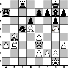 Partie-Notation im PGN-Format [Event "Sommer 2025_1"] [Site "www.mySchach.de"] [Date "2025.06.20"] [Round "1"] [White "UPS"] [Black "kalle"] [ECO "B23"] [WhitemyELO "1647"] [BlackmyELO "1651"] [Result "1-0"] [TimeControl "10/1728000"] [WhiteDays "37"] [BlackDays "27"] [MySchachNr "133444"] 1. e4 c5 2. Nc3 g6 3. d4 cxd4 4. Qxd4 Nf6 5. Bd3 Bg7 6. Bd2 Nc6 7. Qe3 d6 8. Nf3 Bd7 9. h3 O-O 10. O-O a6 11. a3 b5 12. Nd5 Na5 13. Nb6 Nc4 14. Bxc4 Rb8 15. Nxd7 Nxd7 16. Ba2 Bxb2 17. Rab1 Bg7 18. c4 bxc4 19. Bxc4 Qc7 20. Rxb8 Rxb8 21. Bxa6 Nc5 22. Rc1 Qa7 23. Bc4 Ra8 24. Bb4 Bb2 25. Rb1 Bg7 26. Bd5 Rb8 27. Rb3 Rc8 28. Ng5 1-0 Stellungs-Notation im FEN-Format 2r3k1/q3ppbp/3p2p1/2nB2N1/1B2P3/PR2Q2P/4PPP1/6K1 - - - 14 28 Geschlagene Figuren Weiss: Geschlagene Figuren Schwarz: Klicken Sie auf eine geschlagene Figur um den gewünschten Zug darzustellen!