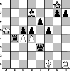 Partie-Notation im PGN-Format [Event "Spa"] [Site "www.mySchach.de"] [Date "2008.10.21"] [Round "1"] [White "Master1"] [Black "MichaelKnopf"] [ECO "D02"] [WhitemyELO "1252"] [BlackmyELO "1022"] [Result "0-1"] [TimeControl "10/2592000"] [WhiteDays "123"] [BlackDays "147"] [MySchachNr "48943"] 1. d4 d5 2. Nf3 Nc6 3. Nc3 e6 4. Bf4 Bb4 5. Qd2 Nge7 6. Ne5 O-O 7. O-O-O f6 8. Nxc6 bxc6 9. e3 Ng6 10. a3 Bxc3 11. Qxc3 Qd7 12. Bg3 f5 13. h3 a6 14. f4 Qd6 15. b4 Bd7 16. a4 Qe7 17. h4 Nh8 18. h5 Nf7 19. Bh4 Qe8 20. g3 Nh6 21. Kd2 Ng4 22. Bh3 Nf2 23. g4 Ne4+ 24. Kd3 Nxc3 25. Kxc3 a5 26. g5 Qxh5 27. Bf2 Qf3 28. Bh4 Qxe3+ 29. Rd3 Qxf4 30. Bg3 Qxg5 31. Bxc7 axb4+ 32. Kxb4 Bc8 33. Bd6 Rf7 34. a5 Rb7+ 35. Ka4 Bd7 36. Rb3 Rxb3 37. Kxb3 Rxa5 38. Bb4 Rb5 39. Bf1 Rb6 40. c4 Qe3+ 41. Ka4 c5+ 42. Ka5 Rxb4 0-1 Stellungs-Notation im FEN-Format 6k1/3b2pp/4p3/K1pp1p2/1rPP4/4q3/8/5B1R - - - 0 43 Geschlagene Figuren Weiss: Geschlagene Figuren Schwarz: Klicken Sie auf eine geschlagene Figur um den gewünschten Zug darzustellen!