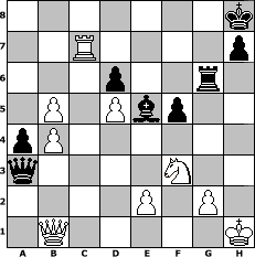 Partie-Notation im PGN-Format [Event "fso2-1-16"] [Site "www.mySchach.de"] [Date "2007.07.08"] [Round "1"] [White "reymund"] [Black "Bolligru"] [ECO "B90"] [WhitemyELO "1578"] [BlackmyELO "2115"] [Result "1/2-1/2"] [TimeControl "10/2592000"] [WhiteDays "24"] [BlackDays "12"] [MySchachNr "36224"] 1. e4 c5 2. Nf3 d6 3. d4 cxd4 4. Nxd4 Nf6 5. Nc3 a6 6. Be3 e5 7. Nf3 Be7 8. Bc4 O-O 9. O-O Nc6 10. Qd3 Na5 11. Bd5 Be6 12. b4 Nc6 13. Rab1 a5 14. b5 Nb4 15. Qd2 Nfxd5 16. exd5 Bf5 17. Ne1 Qc7 18. Na4 Rac8 19. Rb3 Bd7 20. Nb6 f5 21. Nxd7 Qxd7 22. f4 g5 23. c3 gxf4 24. Bf2 e4 25. cxb4 e3 26. Bxe3 a4 27. Ra3 fxe3 28. Rxe3 Bd8 29. Rg3+ Kh8 30. Qd4+ Bf6 31. Qd3 Rc3 32. Qd2 Rxg3 33. hxg3 Qg7 34. Nf3 Qxg3 35. Rc1 Bd8 36. Qc3+ Bf6 37. Qe1 Qg4 38. Rc7 Rg8 39. Qf2 b6 40. Rf7 Bc3 41. a3 Qe4 42. Rc7 Qb1+ 43. Kh2 Bf6 44. Qxb6 Qb2 45. Qg1 Qxa3 46. Qb1 Be5+ 47. Kh1 Rg6 1/2-1/2 Stellungs-Notation im FEN-Format 7k/2R4p/3p2r1/1P1Pbp2/pP6/q4N2/4P1P1/1Q5K - - - 4 48 Geschlagene Figuren Weiss: Geschlagene Figuren Schwarz: Klicken Sie auf eine geschlagene Figur um den gewünschten Zug darzustellen!