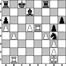 Partie-Notation im PGN-Format [Event "OhneEngine ins neue Jahr"] [Site "www.mySchach.de"] [Date "2009.12.16"] [Round "2"] [White "Steppenwolf"] [Black "commander"] [ECO "C40"] [WhitemyELO "1271"] [BlackmyELO "1154"] [Result "0-1"] [TimeControl "10/2592000"] [WhiteDays "30"] [BlackDays "25"] [MySchachNr "61607"] 1. e4 e5 2. Nf3 f6 3. Nc3 c5 4. Bb5 a6 5. Ba4 b5 6. Bb3 c4 7. Bxc4 bxc4 8. O-O Nc6 9. Re1 d6 10. d3 cxd3 11. cxd3 f5 12. Bg5 Qb6 13. b3 f4 14. Rb1 h6 15. Bh4 g5 16. Bg3 fxg3 17. hxg3 Nf6 18. Nd5 Nxd5 19. exd5 Nb8 20. a3 Nd7 21. d4 Bg7 22. b4 Nf6 23. a4 Ng4 24. dxe5 dxe5 25. a5 Qa7 26. Re2 Bd7 27. Qd4 Qxd4 28. Nxd4 Bf8 29. f3 Nf6 30. Rxe5+ Kd8 31. Ne6+ Kc8 32. Nxf8 Rxf8 33. f4 Ng4 0-1 Stellungs-Notation im FEN-Format r1k2r2/3b4/p6p/P2PR1p1/1P3Pn1/6P1/6P1/1R4K1 - - - 1 34 Geschlagene Figuren Weiss: Geschlagene Figuren Schwarz: Klicken Sie auf eine geschlagene Figur um den gewünschten Zug darzustellen!