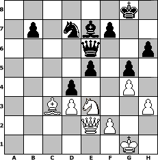 Partie-Notation im PGN-Format [Event "Dabei ist alles 3"] [Site "www.mySchach.de"] [Date "2008.05.14"] [Round "1"] [White "Knight"] [Black "ujack1961"] [ECO "A00"] [WhitemyELO "1255"] [BlackmyELO "1693"] [Result "0-1"] [TimeControl "10/864000"] [WhiteDays "10"] [BlackDays "10"] [MySchachNr "44852"] 1. b4 c6 2. Bb2 Qb6 3. a3 a5 4. e4 axb4 5. axb4 Rxa1 6. Bxa1 Qxb4 7. Nc3 e5 8. Nf3 d6 9. Be2 Nf6 10. O-O Nxe4 11. Nxe4 Qxe4 12. d3 Qg6 13. Nh4 Qf6 14. g3 Bh3 15. Re1 Be7 16. Bf3 Nd7 17. Bg2 Bxg2 18. Nxg2 O-O 19. c4 Ra8 20. Bc3 Ra2 21. Re2 Rxe2 22. Qxe2 h6 23. Nh4 g5 24. Ng2 Qf5 25. g4 Qe6 26. Ne3 d5 27. cxd5 cxd5 28. h3 d4 0-1 Stellungs-Notation im FEN-Format 6k1/1p1nbp2/4q2p/4p1p1/3p2P1/2BPN2P/4QP2/6K1 - - - 0 29 Geschlagene Figuren Weiss: Geschlagene Figuren Schwarz: Klicken Sie auf eine geschlagene Figur um den gewünschten Zug darzustellen!