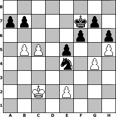 Partie-Notation im PGN-Format [Event "Topas"] [Site "www.mySchach.de"] [Date "2022.08.07"] [Round "1"] [White "Haneken"] [Black "Mynona"] [ECO "C44"] [WhitemyELO "1132"] [BlackmyELO "1454"] [Result "0-1"] [TimeControl "10/864000"] [WhiteDays "10"] [BlackDays "10"] [MySchachNr "126735"] 1. e4 e5 2. Nf3 Nc6 3. d3 Bc5 4. Be3 Bxe3 5. fxe3 d6 6. Nc3 Bg4 7. Nd5 Nf6 8. h3 Bxf3 9. Qxf3 Nxd5 10. exd5 Nb4 11. O-O-O Nxa2+ 12. Kb1 Nb4 13. c3 Na6 14. d4 Qe7 15. Bb5+ Kf8 16. Rhf1 f6 17. h4 Kf7 18. h5 h6 19. Qf5 Kg8 20. Bd7 Rd8 21. Bc8 Nb8 22. Be6+ Kf8 23. dxe5 dxe5 24. Qg6 c6 25. dxc6 Nxc6 26. Rxd8+ Nxd8 27. Qf5 Qxe6 28. Qxe6 Nxe6 29. b4 Kf7 30. Rd1 Rd8 31. Rc1 Nc7 32. e4 Rd3 33. Kb2 Rd2+ 34. Rc2 Rxc2+ 35. Kxc2 Ne6 36. c4 Nf4 37. g4 Nh3 38. b5 Nf2 39. c5 Nxe4 0-1 Stellungs-Notation im FEN-Format 8/pp3kp1/5p1p/1PP1p2P/4n1P1/8/2K1P3/8 - - - 0 40 Geschlagene Figuren Weiss: Geschlagene Figuren Schwarz: Klicken Sie auf eine geschlagene Figur um den gewünschten Zug darzustellen!