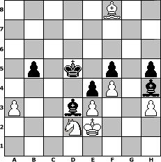 Partie-Notation im PGN-Format [Event "2016"] [Site "www.mySchach.de"] [Date "2016.01.01"] [Round "1"] [White "FrankB"] [Black "Helmut48"] [ECO "A46"] [WhitemyELO "1669"] [BlackmyELO "1965"] [Result "0-1"] [TimeControl "10/2592000"] [WhiteDays "30"] [BlackDays "30"] [MySchachNr "101926"] 1. d4 Nf6 2. Nf3 d5 3. c4 e6 4. e3 Be7 5. Nc3 c5 6. a3 O-O 7. Be2 dxc4 8. Bxc4 a6 9. dxc5 Qxd1+ 10. Nxd1 Bxc5 11. O-O b5 12. Be2 Bb7 13. b4 Bd6 14. Bb2 Nbd7 15. Rc1 Rac8 16. Nc3 Rfd8 17. h3 Nb6 18. Rfd1 Nc4 19. Bxc4 Rxc4 20. Nd2 Rc7 21. Ne2 Rcd7 22. Bd4 Be7 23. Rc2 Ne4 24. f3 Nxd2 25. Rcxd2 f5 26. Bc3 Rxd2 27. Rxd2 Rxd2 28. Bxd2 e5 29. Nc3 Bg5 30. Kf2 Kf7 31. Ke2 e4 32. f4 Bd8 33. Nb1 Bd5 34. Bc3 g5 35. g3 Bc4+ 36. Kf2 gxf4 37. gxf4 Ke6 38. Kg3 Kd5 39. Bd4 Bd3 40. Nd2 Bc2 41. Be5 a5 42. Bc3 axb4 43. Bxb4 Bd1 44. Kf2 Bh4+ 45. Kf1 h5 46. Bf8 Bf6 47. Ke1 Ba4 48. Bb4 Bc2 49. Ke2 Bh4 50. Bf8 Bd3+ 0-1 Stellungs-Notation im FEN-Format 5B2/8/8/1p1k1p1p/4pP1b/P2bP2P/3NK3/8 - - - 10 51 Geschlagene Figuren Weiss: Geschlagene Figuren Schwarz: Klicken Sie auf eine geschlagene Figur um den gewünschten Zug darzustellen!