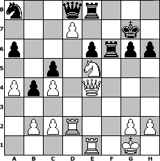 Partie-Notation im PGN-Format [Event "ComeBack"] [Site "www.mySchach.de"] [Date "2008.11.09"] [Round "1"] [White "bane"] [Black "murphy12"] [ECO "A10"] [WhitemyELO "1778"] [BlackmyELO "1686"] [Result "1-0"] [TimeControl "10/1728000"] [WhiteDays "80"] [BlackDays "80"] [MySchachNr "49657"] 1. c4 g6 2. d4 Bg7 3. e4 c5 4. d5 d6 5. Nc3 Nf6 6. Bd3 O-O 7. Nf3 Bg4 8. O-O Na6 9. Be2 Nc7 10. Bf4 Nd7 11. Nd2 Bxe2 12. Qxe2 a6 13. Bg5 b5 14. a4 b4 15. Nd1 f5 16. exf5 Rxf5 17. f4 Rf7 18. Re1 Nf6 19. Nf2 Qd7 20. Nf3 Raf8 21. Nd3 h6 22. Bxf6 Bxf6 23. Qe4 Kg7 24. Rac1 Kh7 25. Rcd1 Kg7 26. Rd2 Re8 27. Nde5 dxe5 28. fxe5 e6 29. exf6+ Rxf6 30. d6 Na8 31. Ne5 Qd8 32. d7 1-0 Stellungs-Notation im FEN-Format n2qr3/3P2k1/p3prpp/2p1N3/PpP1Q3/8/1PPR2PP/4R1K1 - - - 0 32 Geschlagene Figuren Weiss: Geschlagene Figuren Schwarz: Klicken Sie auf eine geschlagene Figur um den gewünschten Zug darzustellen!