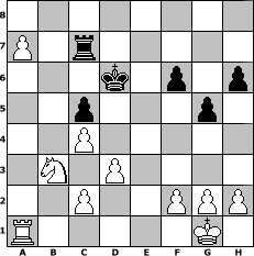 Partie-Notation im PGN-Format [Event "^^Frohes neues Jahr^^"] [Site "www.mySchach.de"] [Date "2007.12.29"] [Round "1"] [White "Andylein1989"] [Black "Master1"] [ECO "C55"] [WhitemyELO "1412"] [BlackmyELO "1242"] [Result "1-0"] [TimeControl "10/864000"] [WhiteDays "39"] [BlackDays "24"] [MySchachNr "41084"] 1. e4 e5 2. Nf3 Nc6 3. Bc4 Nf6 4. Nc3 Bb4 5. a3 Bxc3 6. bxc3 Nxe4 7. Qe2 h6 8. Qxe4 d6 9. Qd5 Be6 10. Qd3 Bxc4 11. Qxc4 d5 12. Qb5 O-O 13. Qxb7 Na5 14. Qb4 Nc6 15. Qc5 Qf6 16. Qxd5 Rad8 17. Qe4 Rfe8 18. O-O a6 19. Bb2 Re7 20. Rfe1 Re6 21. d3 Ne7 22. c4 Ng6 23. Bxe5 Qe7 24. Qf5 Nxe5 25. Rxe5 Rxe5 26. Qxe5 Qxe5 27. Nxe5 f6 28. Nc6 Rd7 29. Nb4 a5 30. Nc6 g5 31. Nxa5 c5 32. Nb3 Rc7 33. a4 Kf7 34. a5 Ke6 35. a6 Kd6 36. a7 1-0 Stellungs-Notation im FEN-Format 8/P1r5/3k1p1p/2p3p1/2P5/1N1P4/2P2PPP/R5K1 - - - 0 36 Geschlagene Figuren Weiss: Geschlagene Figuren Schwarz: Klicken Sie auf eine geschlagene Figur um den gewünschten Zug darzustellen!